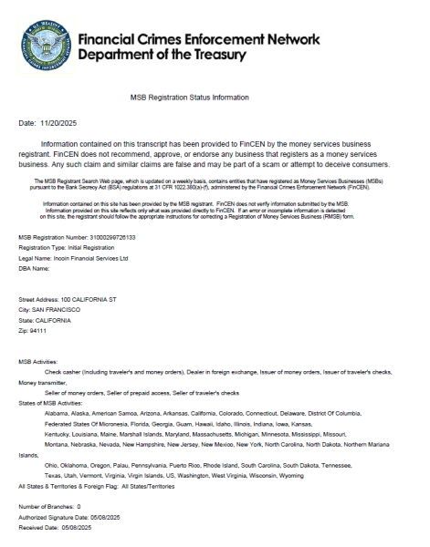 Incoin Financial Services has officially received a Money Services Business (MSB) license from the U.S. Department of the Treasury’s Financial Crimes Enforcement Network (FinCEN), reinforcing its global compliance capabilities and operational transparency.